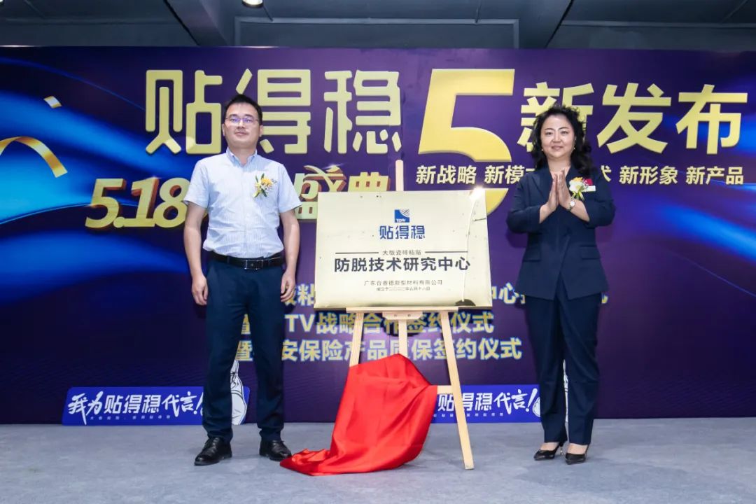 广东合睿德新型材料有限公司总经理胡媛女士与贴得稳大板瓷砖胶品牌技术总监杜洪雨先生现场揭牌