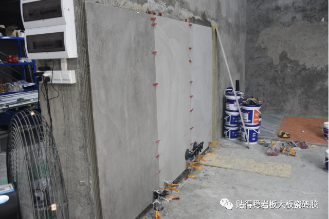 接下来就是第二片岩板的铺贴,岩板铺贴每一个步骤都涉及到非常多的细节,第一片岩板铺贴上墙,第二片第三片也必须与第一片的高度一致,做到严丝合缝。