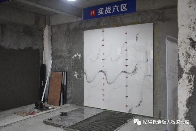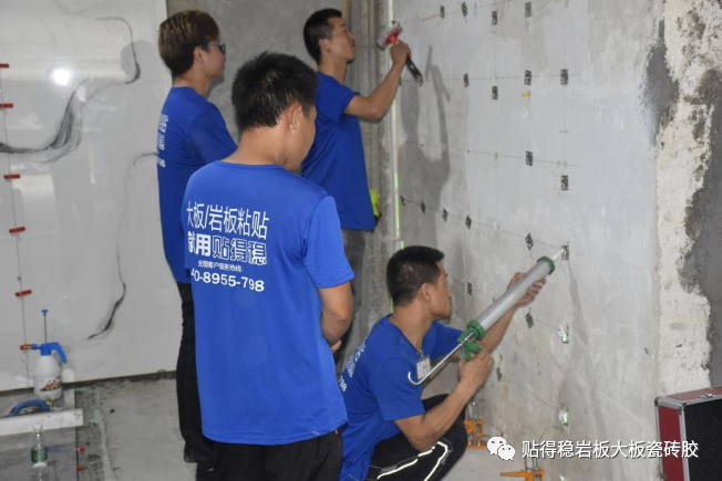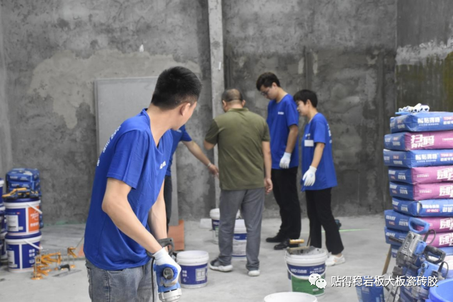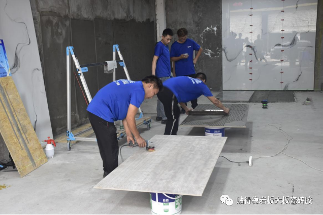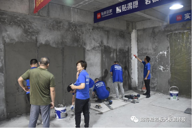 学员们分工合作,一边对墙面上瓷砖胶,一边对岩板背部进行处理,终于在学员们的齐心协力之下,在对已经铺贴的岩板大板进行内部空气排空之后,学员们终于把第一片岩板稳稳当当地铺贴到了墙面上。