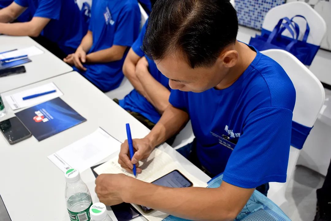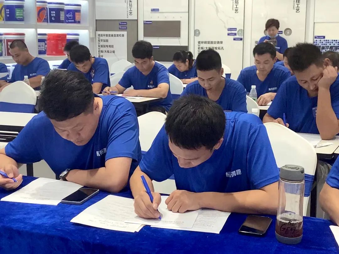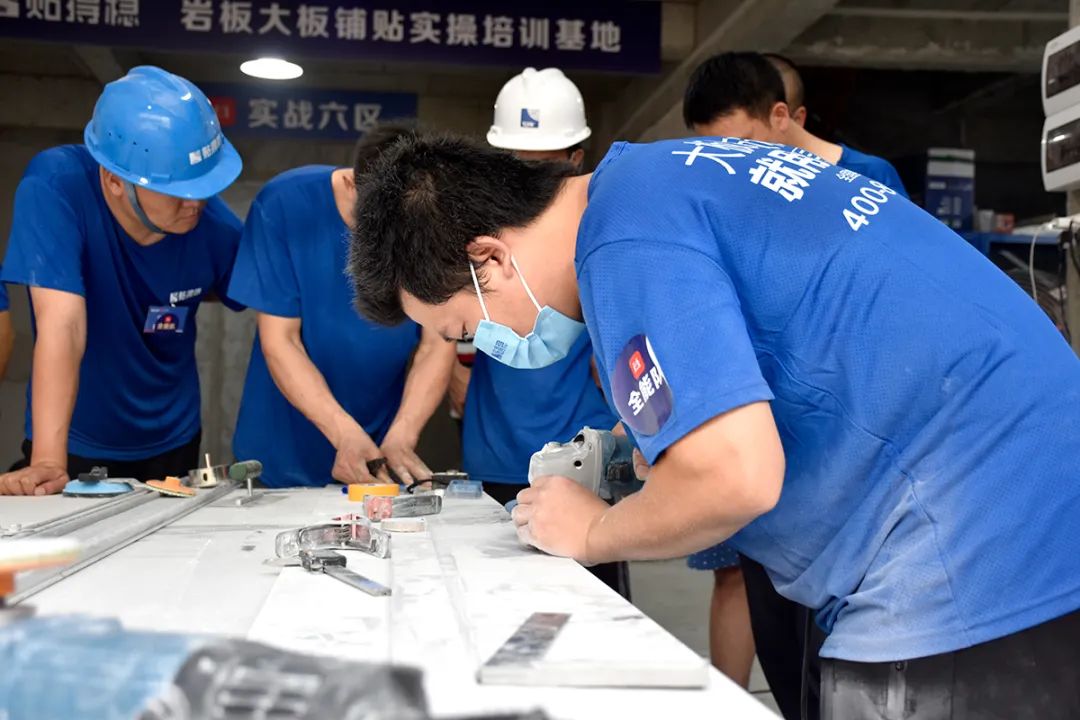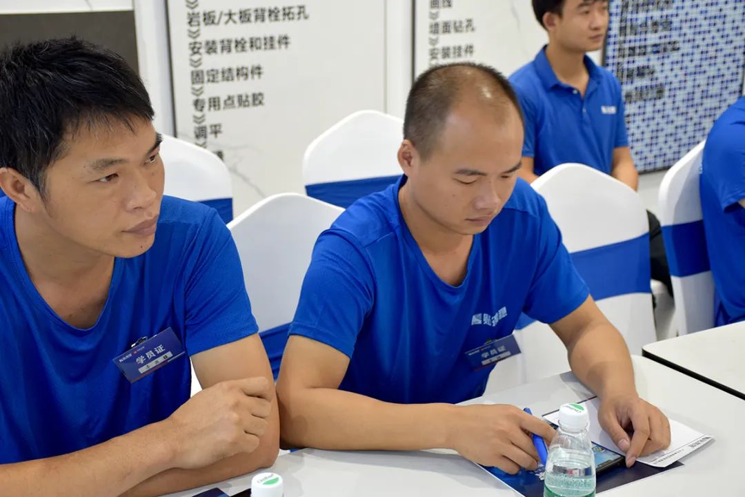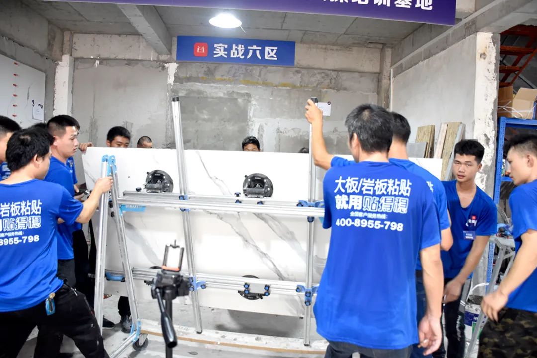 在此次培训中,特聘深圳市合创岩装饰产业建筑服务有限公司创始人、同时也是婷鼎代理商的剑阁为本次培训会的主讲老师。实战前,剑哥首先向师傅和同学们详细讲解了大岩板铺装过程的理论知识。学生们听得很仔细。