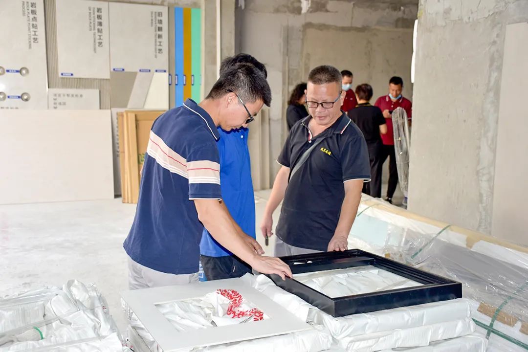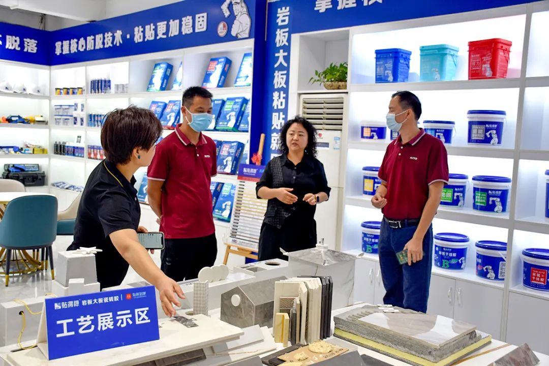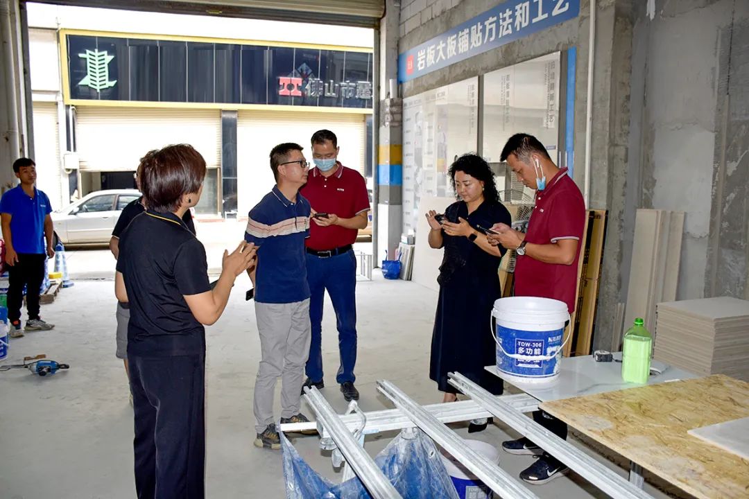 在胡总和徐总的带领下,金意陶精英一行来到了贴得稳商学院培训基地,大家对贴得稳的产、学、研一体化的立体架构模式产生浓厚兴趣。胡总说道,为助力品牌发展,贴得稳通过“贴新到家”一站式岩板大板铺贴服务平台,真正解决岩板大板落地的最后一毫米。同时,金意陶领导也现场视察了合作中施工工艺展示板的制作情况。