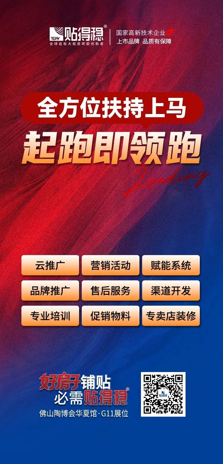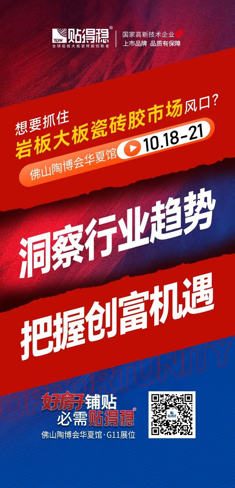 10月18日,第 43 届中国(佛山)陶博会即将启幕!作为岩板大板瓷砖胶行业领先品牌,贴得稳将携三大品质「破局」动作,重磅亮相华夏辅材馆-G11展位!